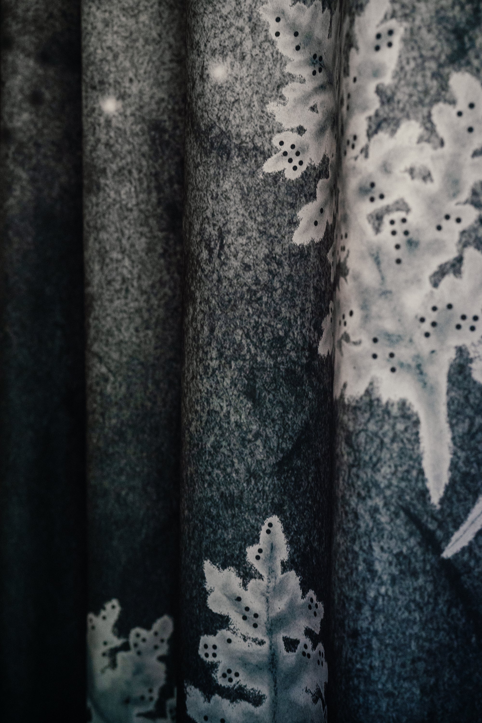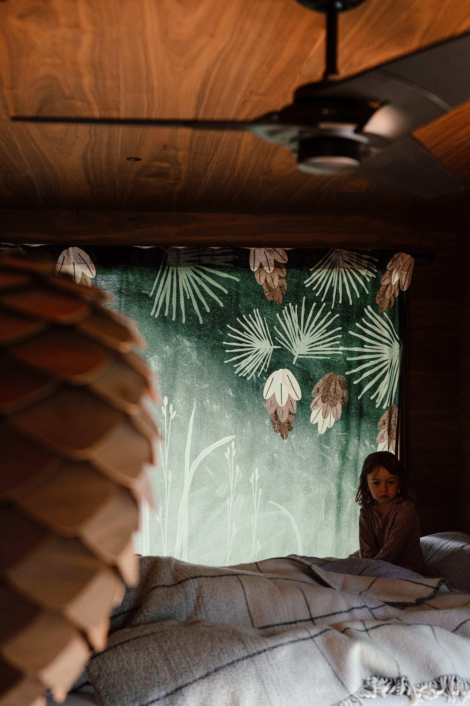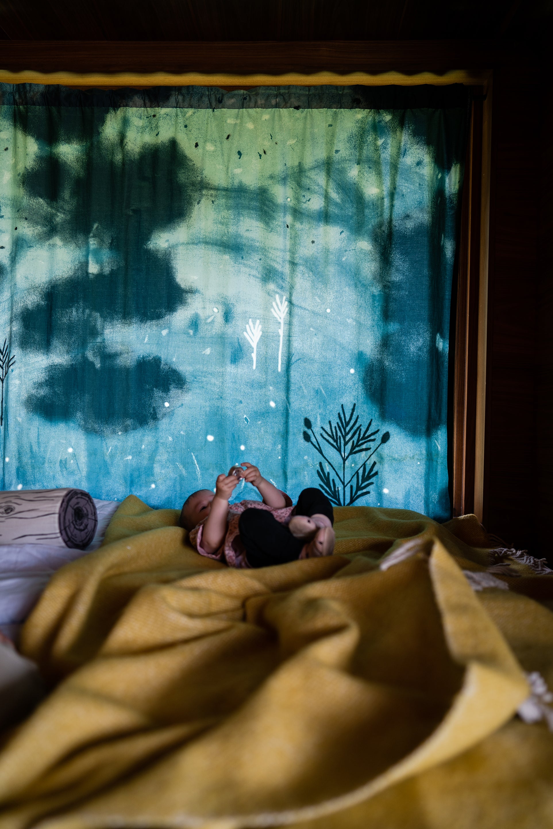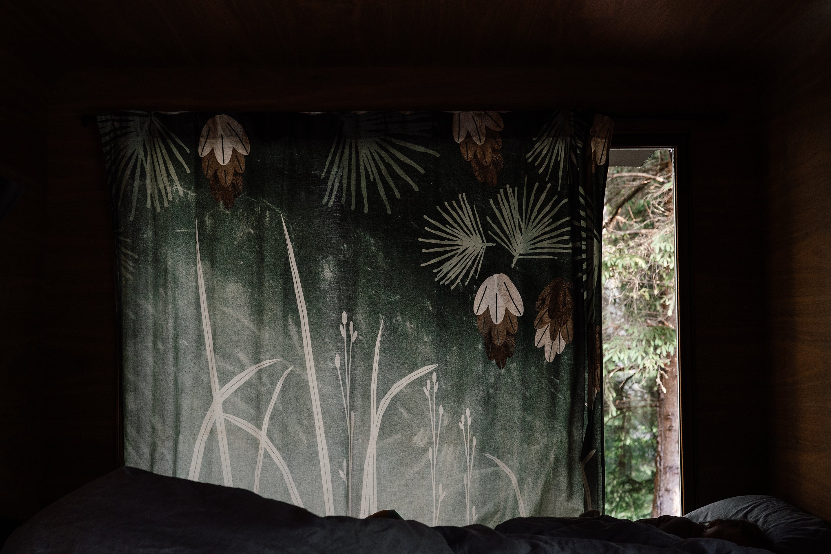 Designer curtains made to measure for tiny houses Hide&seek. Each curtain has an illustrative motif based on the unique location of the glamping accommodation.
