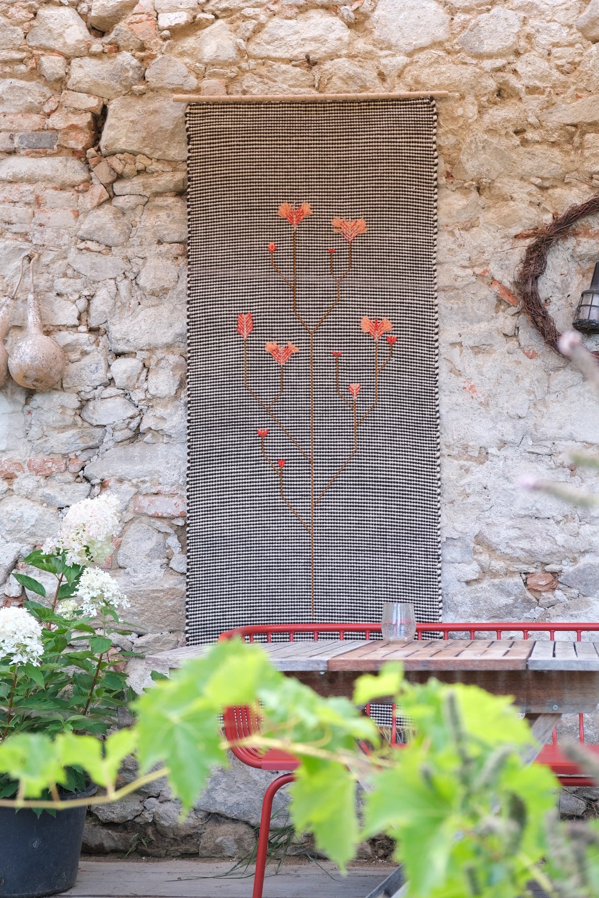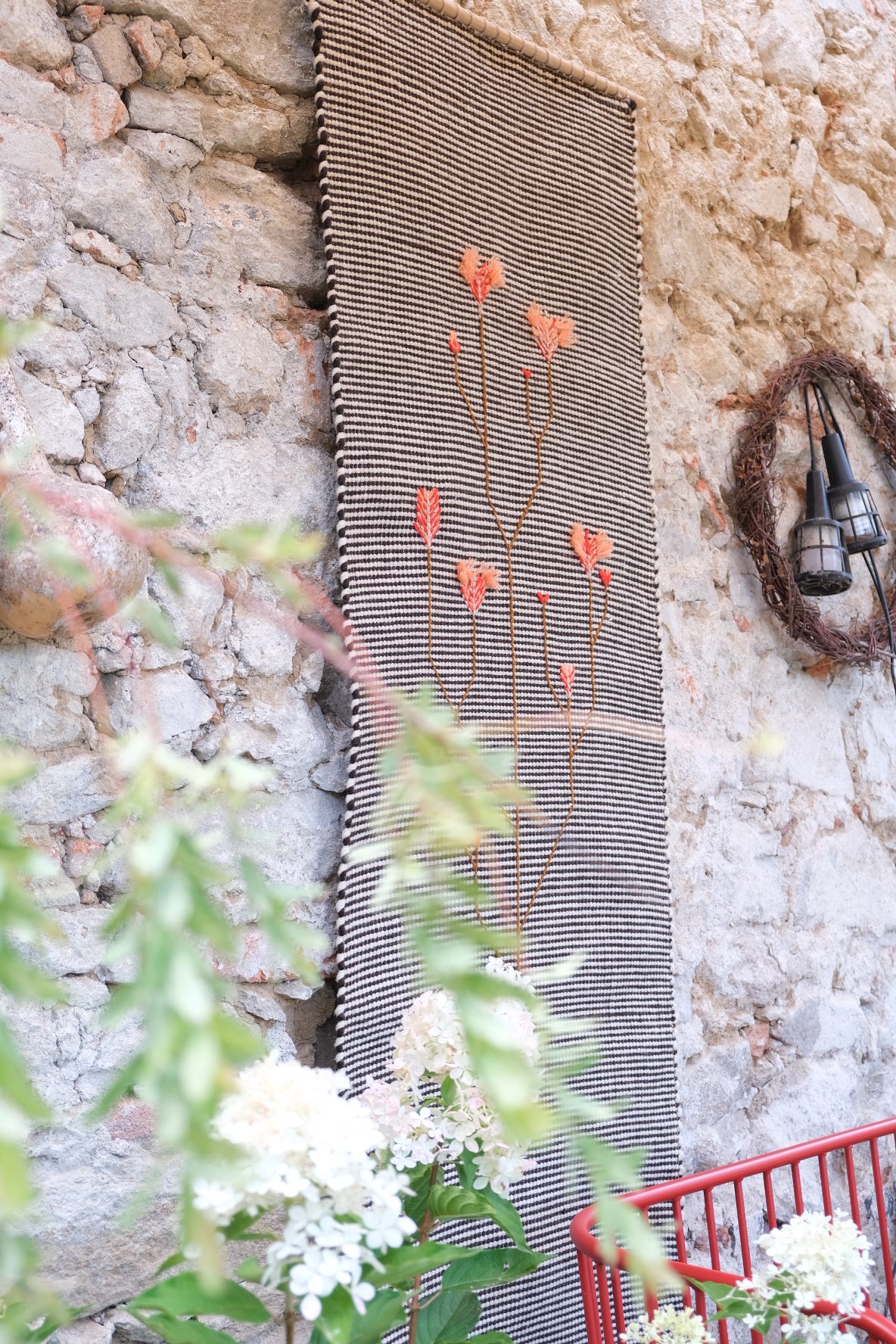 Handwoven wool rug with fine mohair embroidery. For use as a wall tapestry, we supply including an oak rod for hanging.