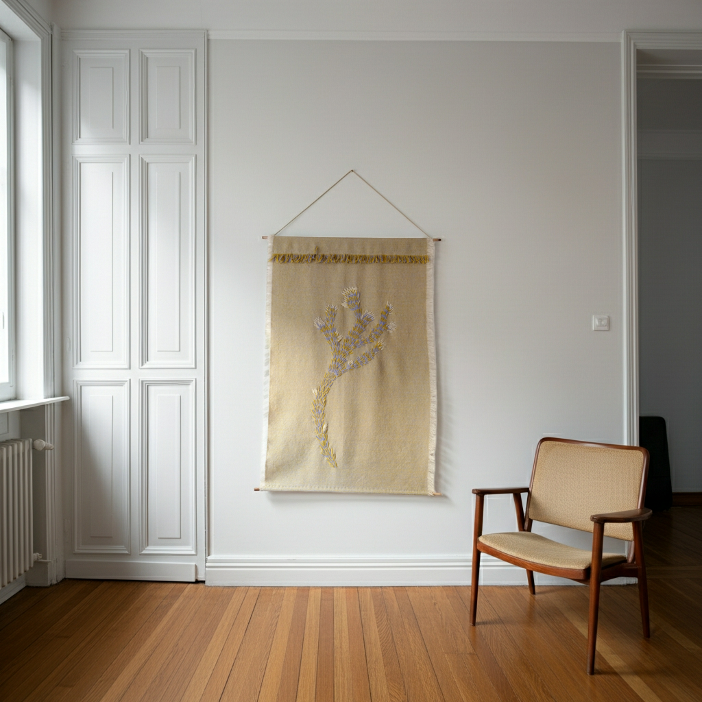Ručně vyšívaná tapiserie na autorské tkanině.